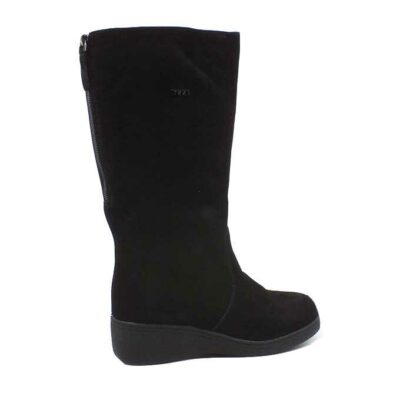 Cizme dama, marca Maria Conti, din piele intoarsa, de culoare neagra. Au talpa ortopedica de 5 cm la baza calcaiului si sunt imblanite. Inchidere cu fermoar in lateral si in spate. Cu ajutorul fermoarului in spate se poate regla latimea carambului. TEX – membrana rezistenta la apa.