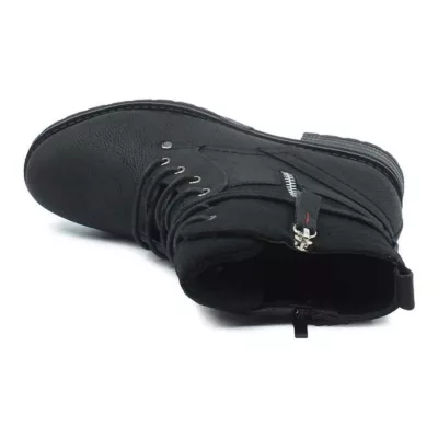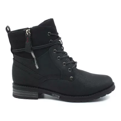 Ghete dama Fashion din piele ecologica si material textil, disponibil in culoarea negru. Modelul prezinta inchidere cu siret si cu fermoar pentru o incaltare mai usoara, este decorat cu un fermoar decorativ in lateral, captusit cu blanita scurta, talpa de 1 cm, cusuta, zimtata, si tocul de 3,2 cm.