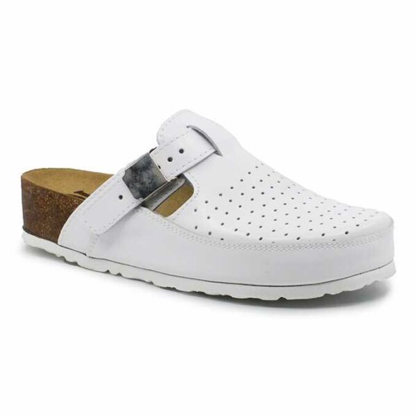 Saboti medicali Ledi pentru dame, din piele, de culoare alba. Au talpa confortabila, groasa de 4 cm, dotata cu brant anatomic. Sunt decorati cu perforatii si echipati cu catarama pentru o reglare ideala dupa latimea piciorului.
