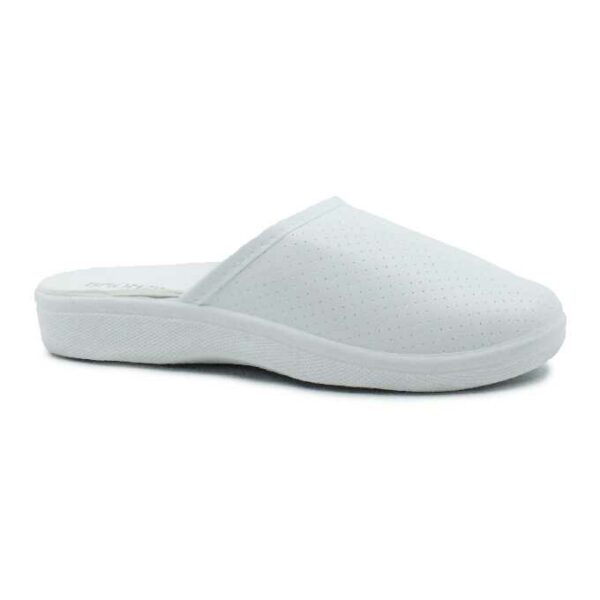 Saboti medicali Confort pentru femei, din piele ecologica, disponibili in culoarea alb. Modelul prezinta perforatii, este usor si are talpa de 2,5cm la baza calcaiului.