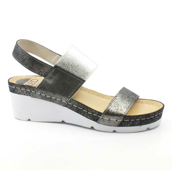 Sandale medicale Ledi pentru dame, din piele, de culoare gri. Au talpa groasa de 6 cm. la baza calcaiului, ortopedica, dotata cu brant anatomic cu gel. Sunt dotati cu elastic pentru o incaltare si acomodare ideala dupa latimea piciorului.